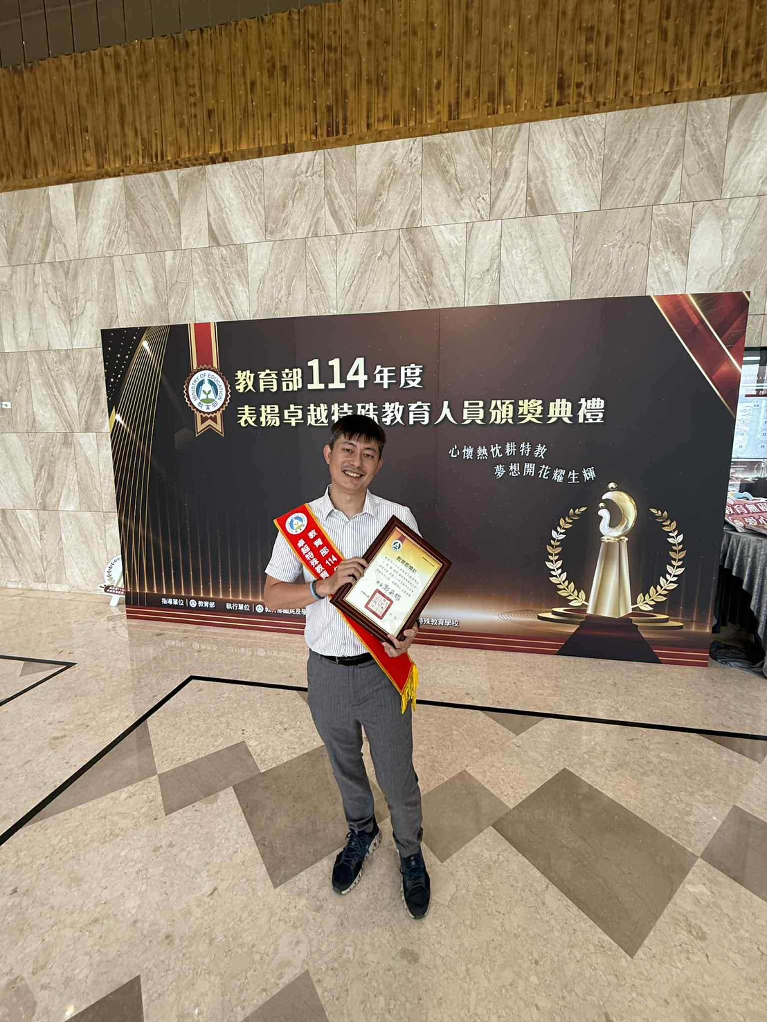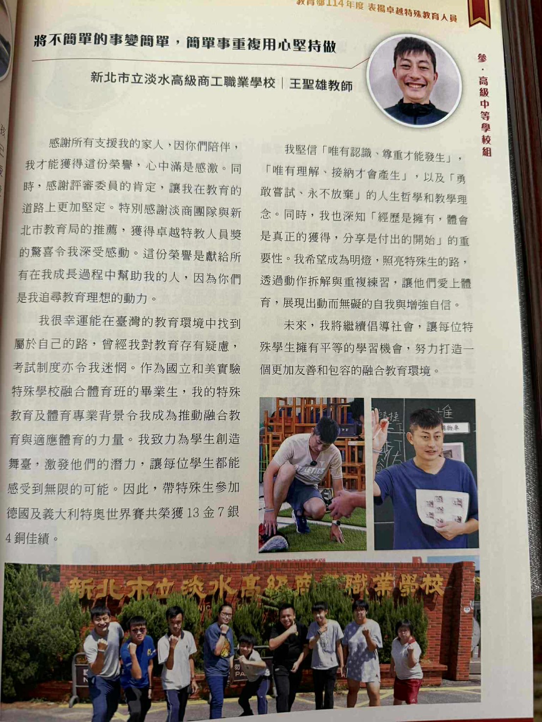 Sep 25 【榮譽校友】狂賀!94級王聖雄學長榮獲教育部卓越特殊教育人員獎 【榮譽校友】狂賀!94級王聖雄學長榮獲教育部卓越特殊教育人員獎【狂賀!94級王聖雄學長榮獲教育部卓越特殊教育人員獎!】 現任職於 淡水商工 的王聖雄學長,榮獲教育部卓越特殊教育人員獎 教育部本月16日舉辦「114年度卓越特殊教育人員」頒獎典禮,表揚長年投入特殊教育、默默耕耘的教育人員。全國共57位卓越特教人員脫穎而出,其中新北市共有8位教師榮獲殊榮,從國小到高中職皆有傑出表現,展現新北在融合教育上的深耕與成果。