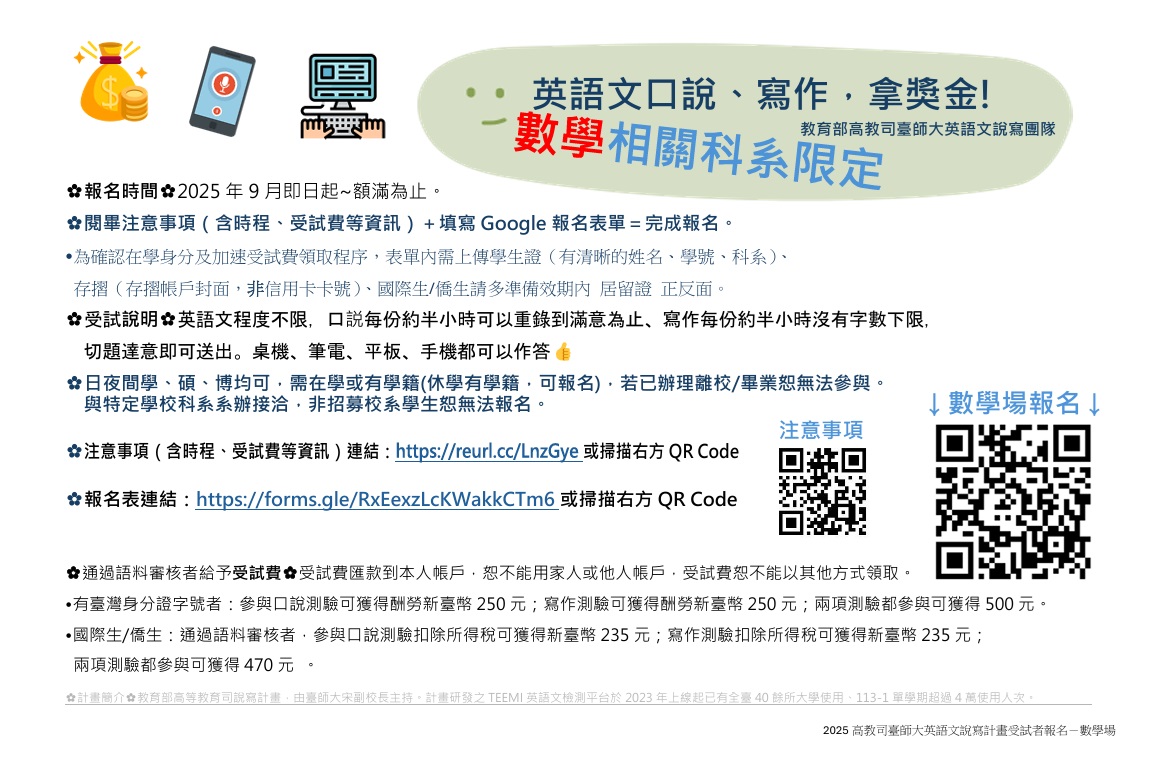 Sep 26 【高教司台師大英語文說寫計畫】 【高教司台師大英語文說寫計畫】✿高教司臺師大英語文說寫計畫招募受試者,2025 9月即日起~額滿為止,英語文口說、寫作線上作答,作答通過審核者將有受試費作為報酬,匯款至本人帳戶。